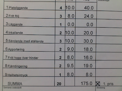 Vi hade en jättehärlig känsla på planen iaf, vilket är viktigare än alla betyg i världen, han var med mig och följsam, kul! Jag skulle vilja se oss på film, för det var flera som kom och kommenterade att han är rolig att titta på! Han ÄR rolig, lika kul att tävla som att titta på tydligen!