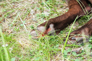 Spajk ledsnade på sina gråa hår mellan tassarna och klev helt sonika i rödfärg!