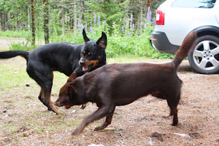 Hundarna trivs utmärkt! Förra ägarna sa "åh, ni kommer aldrig kunna ha hundarna lösa därute" Men inte vet jag vad han menade? Varg? Björn? Dåligt uppfostrade hundar? Ingen aning, men vi klarar då galant att ha lösa hundar därute. Dom blir rejält trötta efter en dag, bilen står öppen så det är bara för dom att hoppa in och ut som dom vill, eller ta en tupplur :)