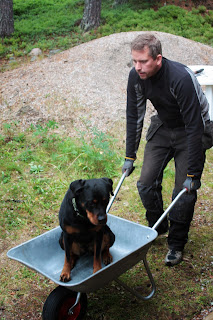 Åka skottkärra var väl "sådär" kul tyckte Spajk....men inte värre än att han när skottkärran stod tom hoppade upp i den, förväntansfullt viftande på svansen!? Knäpphund!