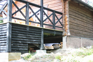 Marken är inte helt jämn där stugan står.... så det blir till att skräddarsy vissa delar, trappan är tex. byggd ovanpå en rejäl sten... Marken lutar så för att täcka in allt blir det till att individanpassa vissa delar! Det är pyssligt men roligt!