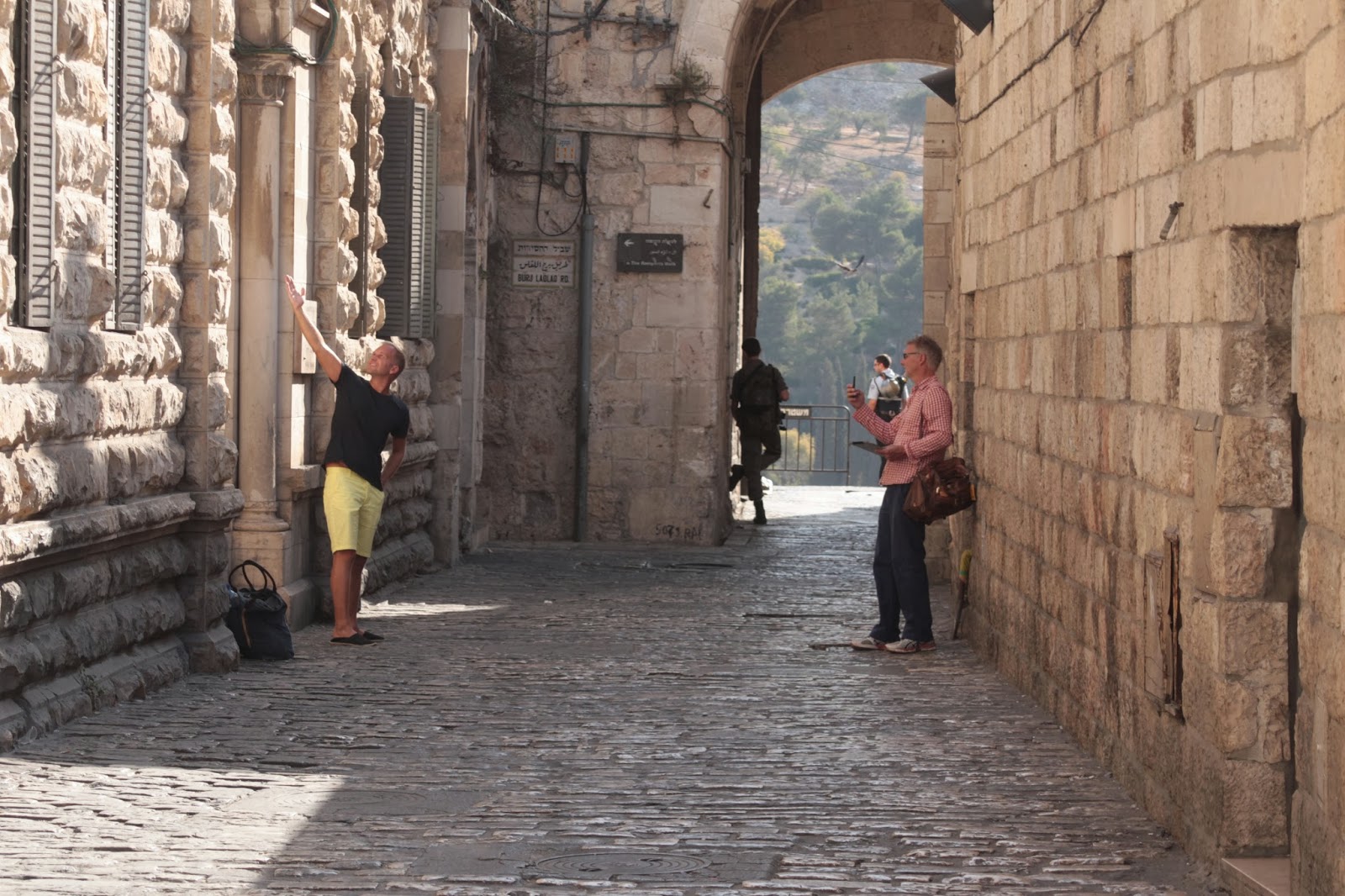 Det var en judisk högtid, Yom Kippur, när vi kom till Jerusalem, så staden var på väg att bokstavligen stängas av, kravallstaket och massa militärer överallt. En del av militärerna var dock inte så farliga, dom hade inte ens magasin i..... men dom hade säkert en lugnade inverkan på folket!