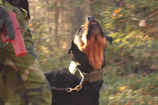 KU-hund hade alltså temat "hundförare tillika skyttesoldat" och iom det så tränades det tillbakaryckning när gruppen är i efterhand och blivit beskjuten i sida, d.v.s. blixtlås. Svårt att hålla koll på sin plats i rörelsen och samtidigt ha en hög mynningsmedvetenhet. Lägg dessutom till hunden så blir det svårt även för oss tjejer ;)